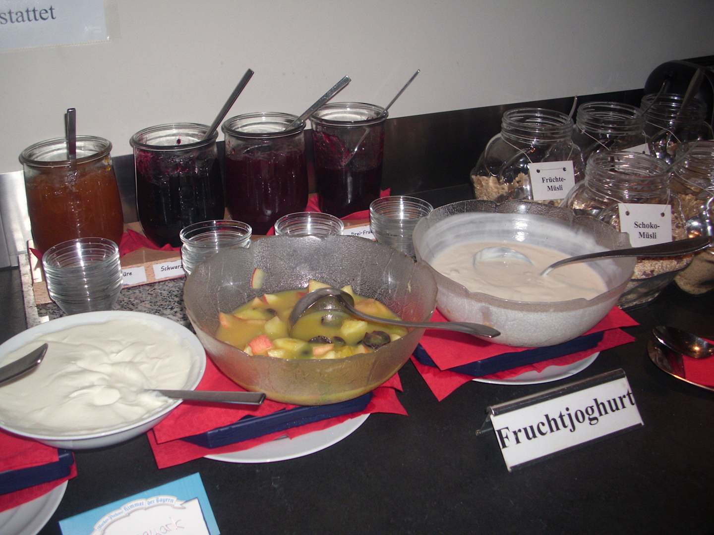 Teil vom Frühstücksbüffet. Marmelade, Joghurt, Müsli usw.