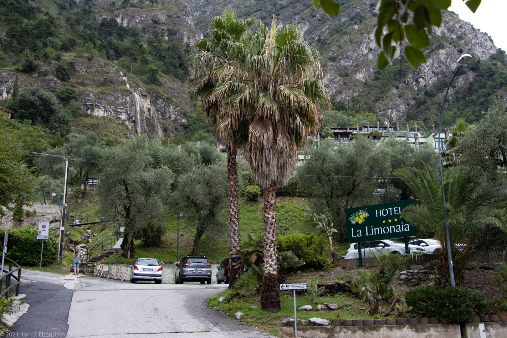 Einfahrt zur Hotelanlage. Oben links Wasserfall Sopino.