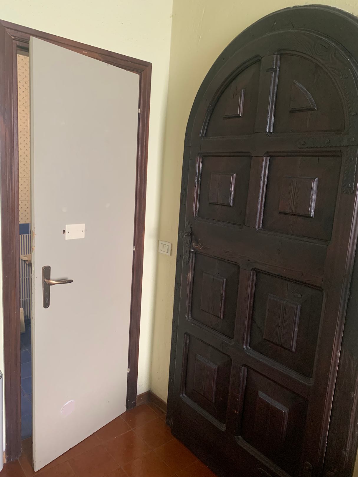 Rustikale Eichentür im Gegensatz zur demolierten Badezimmertür.
