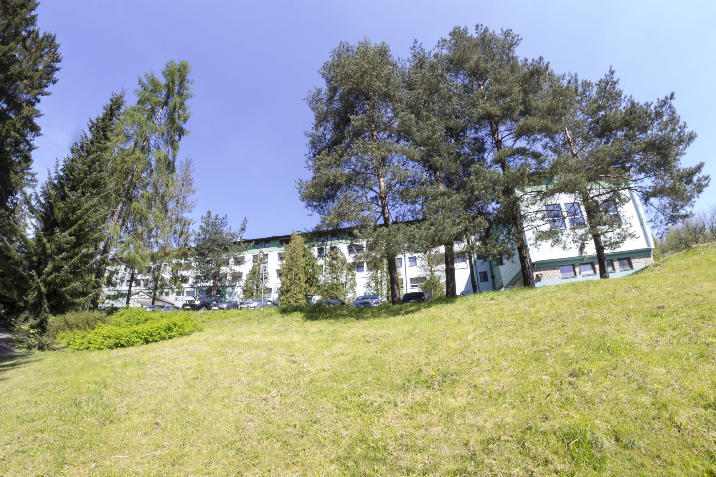 Widok z początku ulicy BukowejWidok budynku ze skrzyżowania głównej ulicy Bukowej i ulicy dojazdowej do ośrodka
