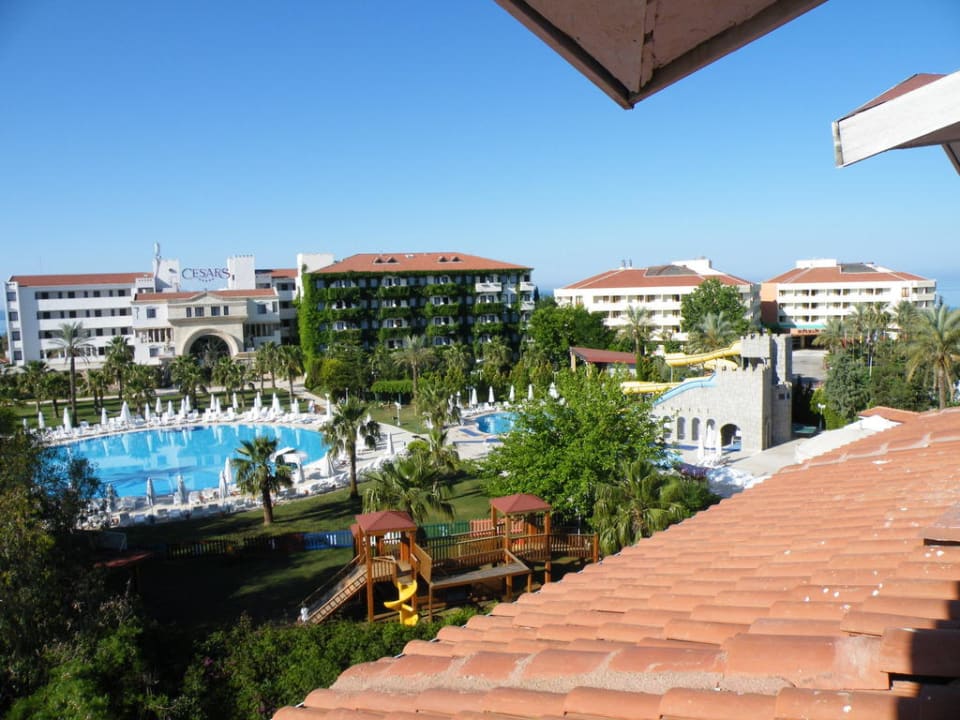 Hier sieht man fast die ganze Anlage, links ein Teil vom großen Pool, davor der Miniclub, hinter der Pool das Hauptgebäude, rechts der Pool mit den Wasserrutschen. Das Hotel rechts ist das Miramare.
