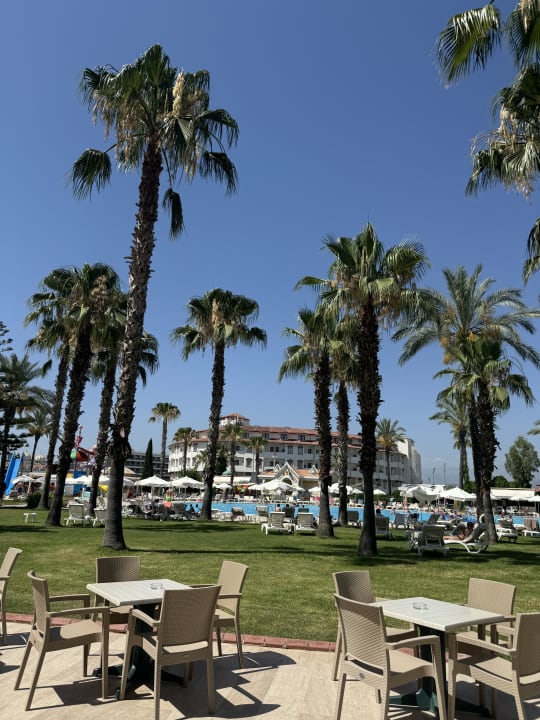 Sehr schön mit vielen Blumen Palmen und Sitz Möglichkeit