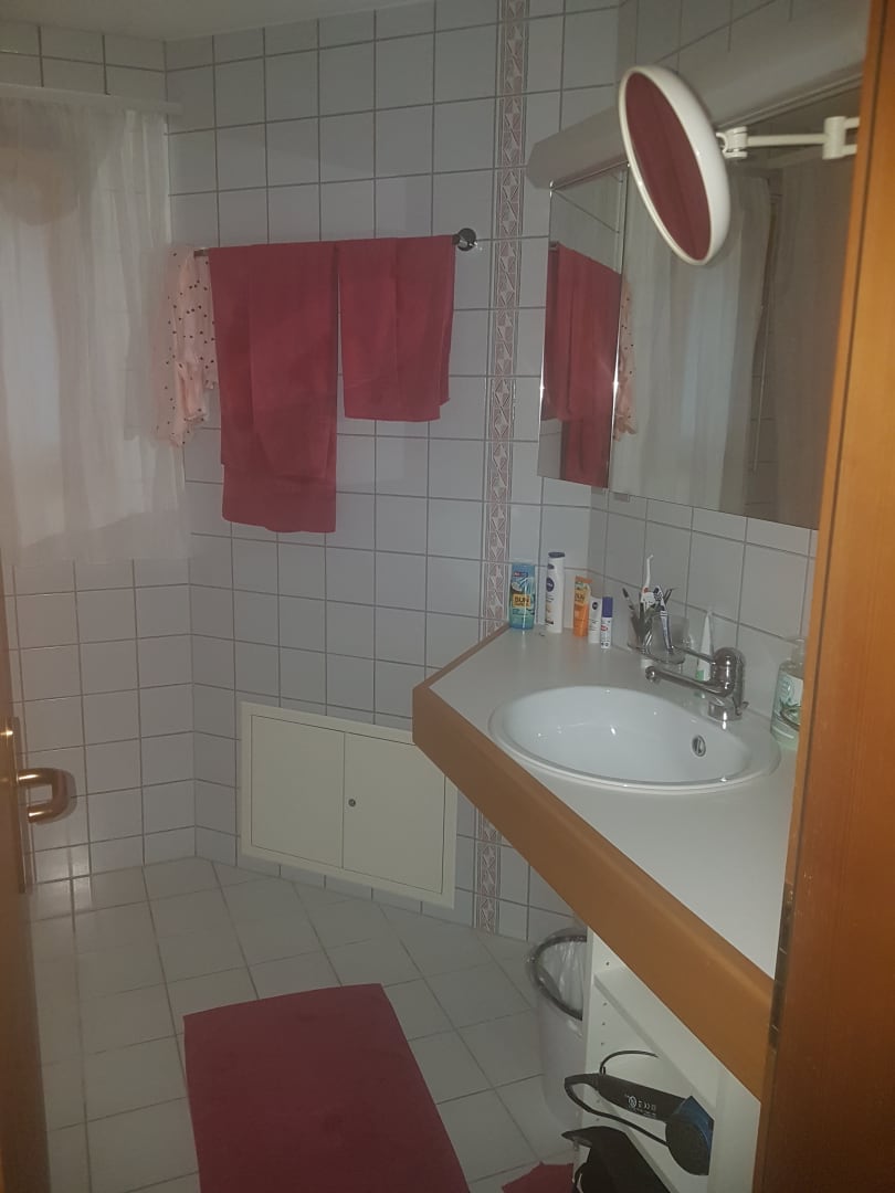 Badezimmer mit Badewanne und großem Spiegel