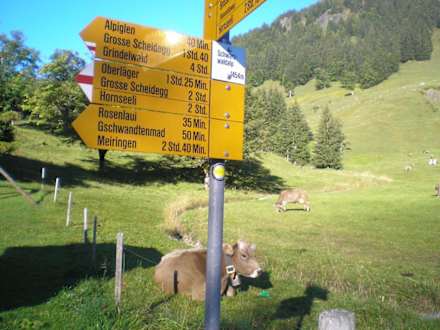 Der Wegweiser direkt vor dem Haus, einschließlich Kuh Nora im Hintergrund