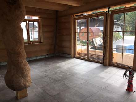 Wohnraum im Erdgeschoß mit Blick auf die Bergwelt und Garten.