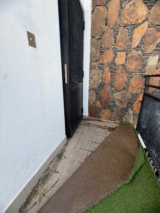 Eingang, schlecht verlegter Kunstrasen Tür verklemmt