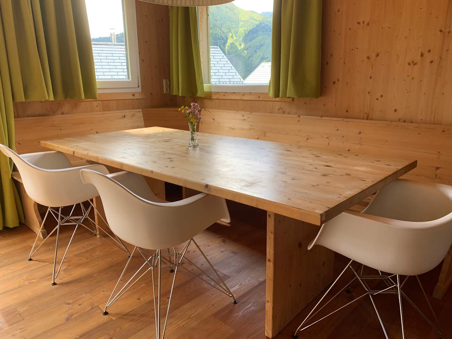 Das Wohnzimmer mit einem supergroßen, gemütlichen Ess-, Spiel- und Plaudertisch.