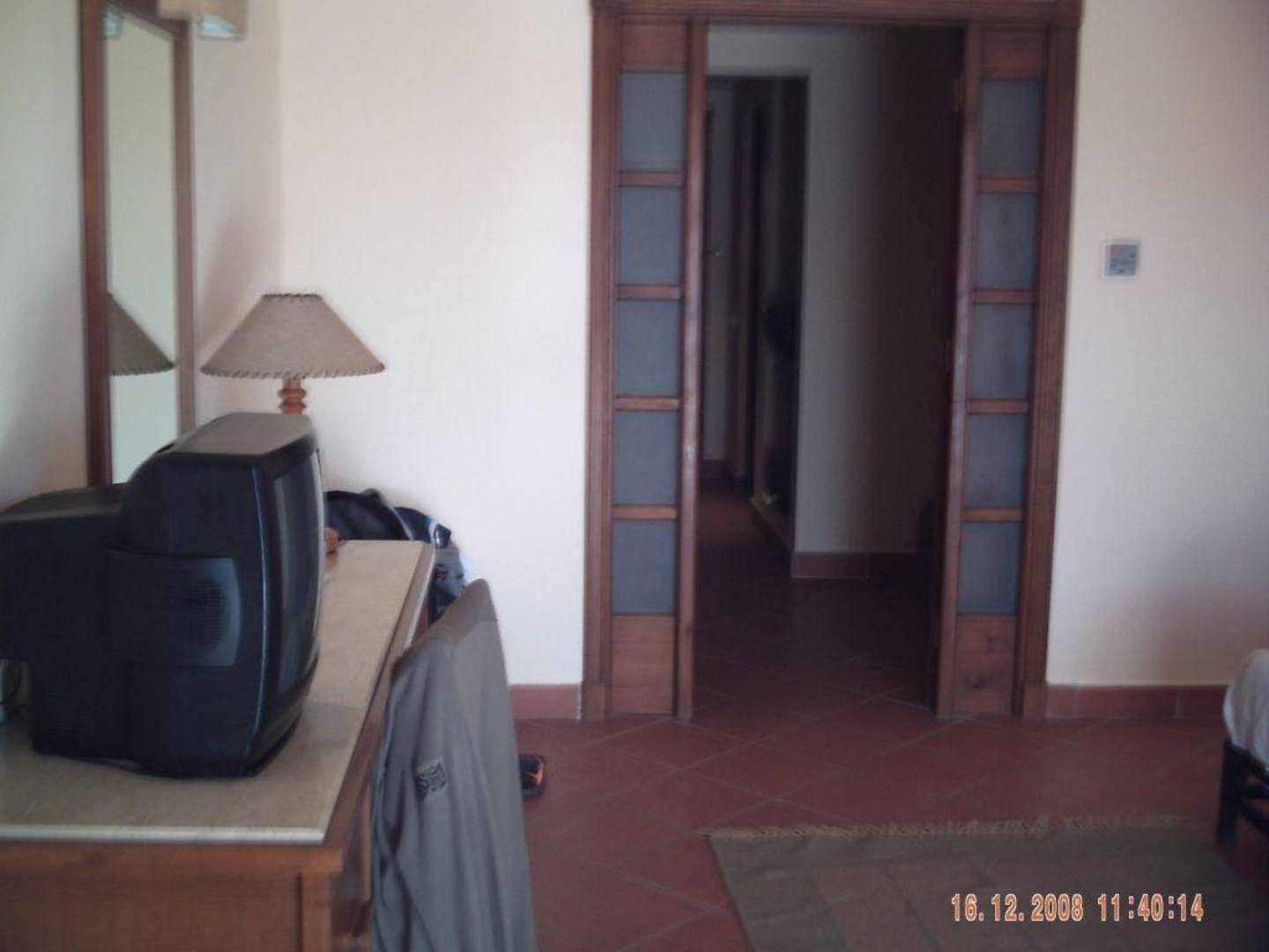 Zimmer im Sea Gardenvorne Eingangstür. Vor der Zwischentür sind noch zwei zusätzliche Betten, auf jeder Seite eines. Dierekt links neben Eingangstür befindet sich der Kleiderschrank und daneben der Kühlschrank. Rechts neben der Eingangstür geht es ins Badezimmer (Waschbecken, WC, Bidet und große Dusche).