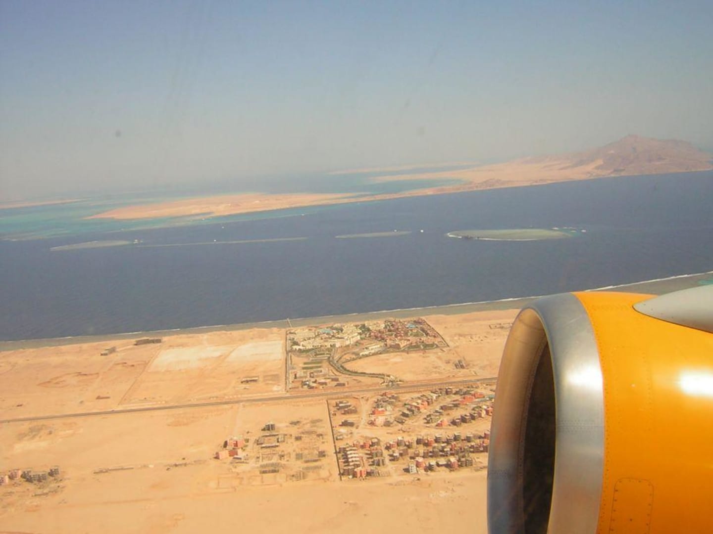 hotel von obenblick aus dem flieger - das sea life resort und der sea club. hier kann man toll die sandbänke sehen, wo das wrack gestrandet ist.