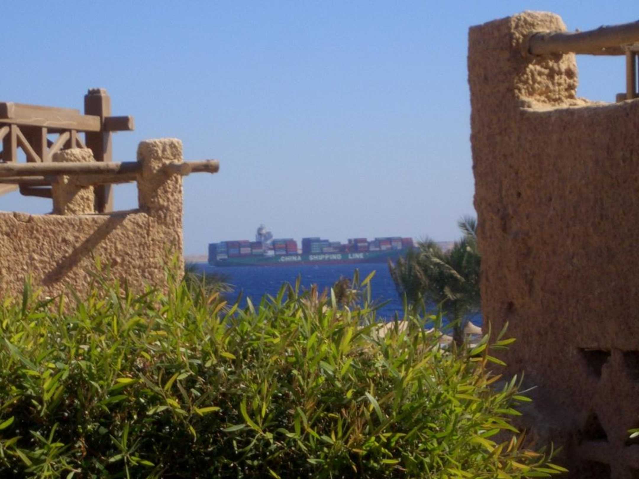 Frachter im Golf von Akaba fährt am Hotel vorbei