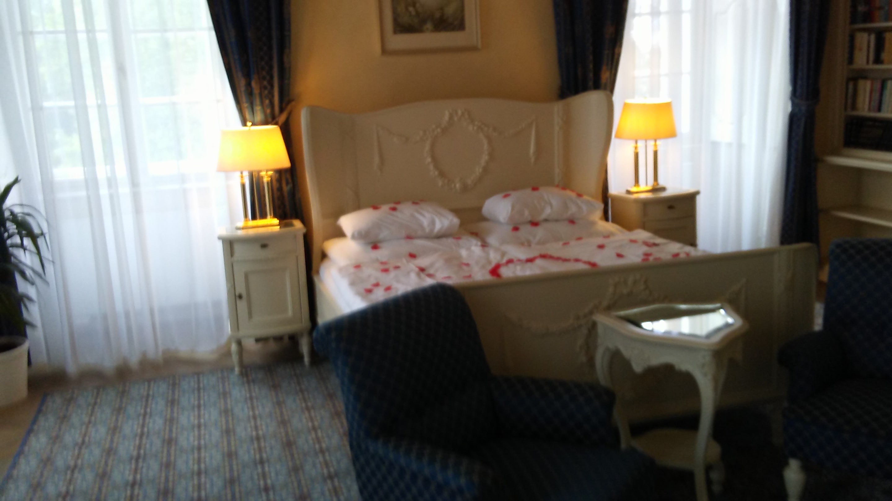 Doppelbett der Hochzeitssuite mit (künstlichen) Rosenblättern zum Empfang