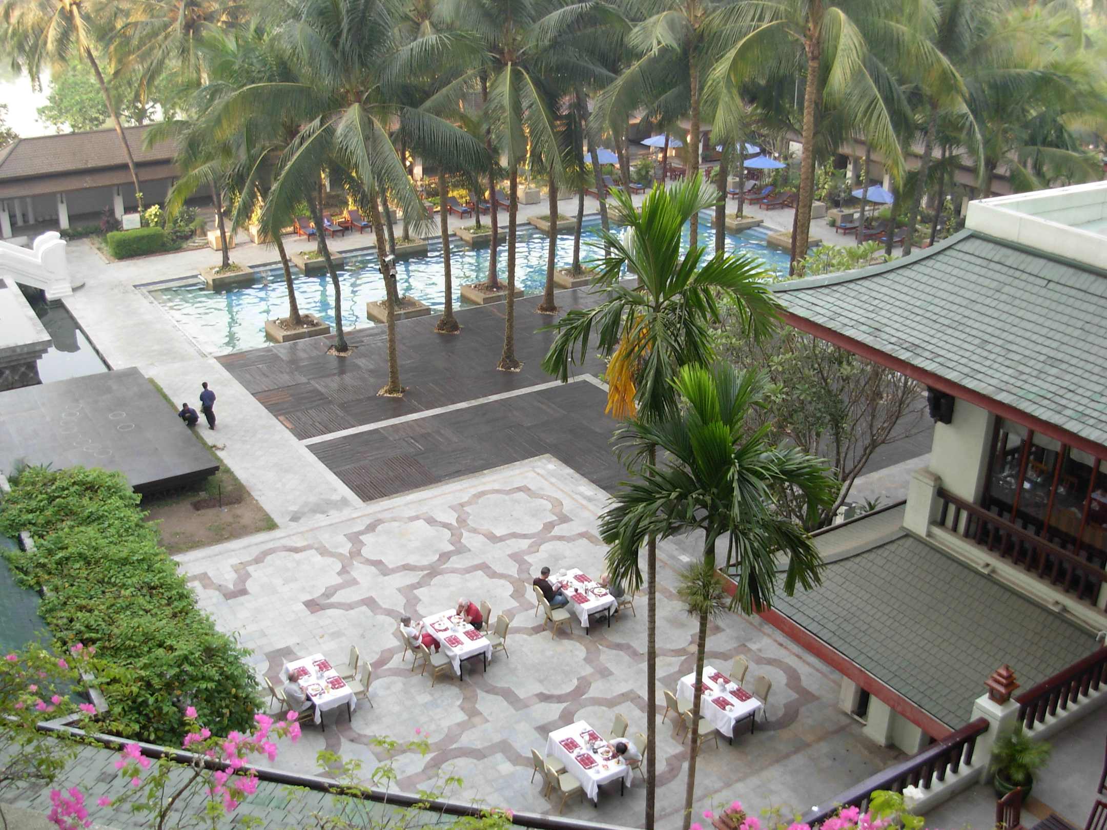 Blick auf Frühstücksterrasse und Pool