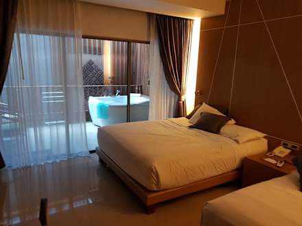 Zimmer mit dem Blick auf den Balkon und dem Whirlpool.