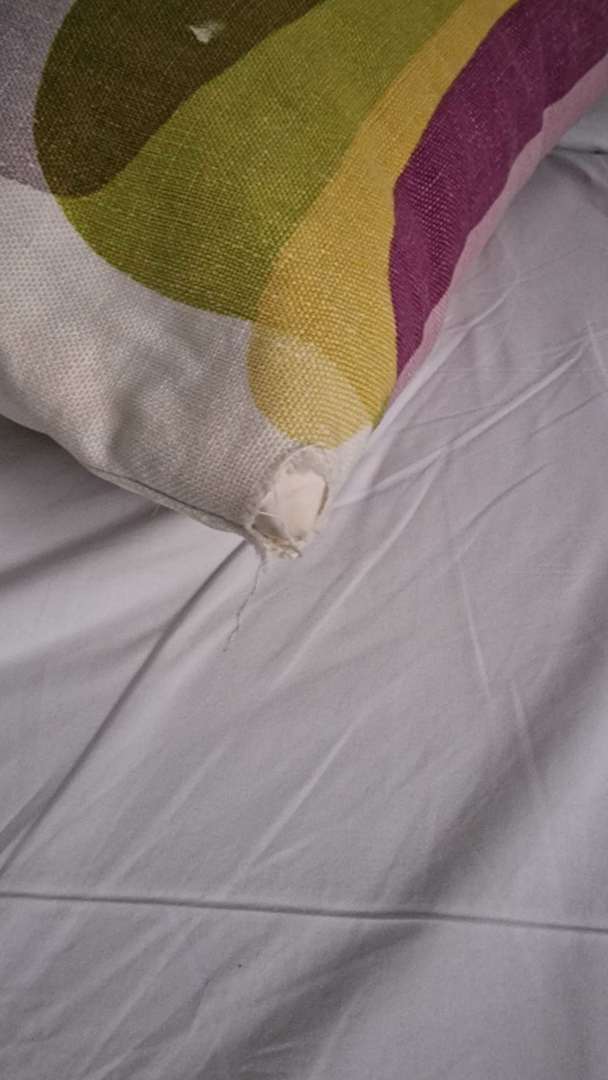Es gab zwei Deko-Kissen: Beide waren an allen Ecken durchgeschlissen und haben gestunken.