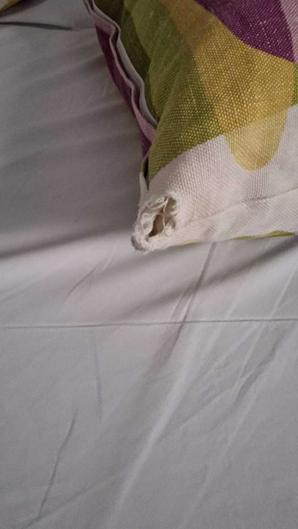 Es gab zwei Deko-Kissen: Beide waren an allen Ecken durchgeschlissen und haben gestunken.