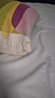 Es gab zwei Deko-Kissen: Beide waren an allen Ecken durchgeschlissen und haben gestunken.