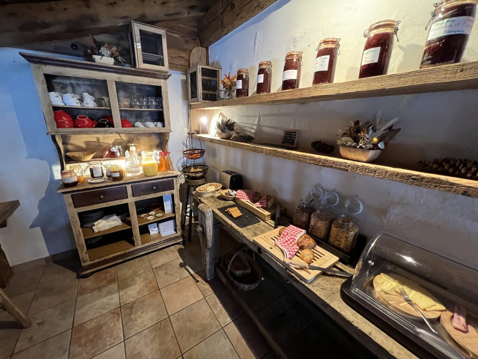 Frühstücksbuffet mit verschiedenen Broten, Käse, Fleisch und selbst gemachten Konfitüren.