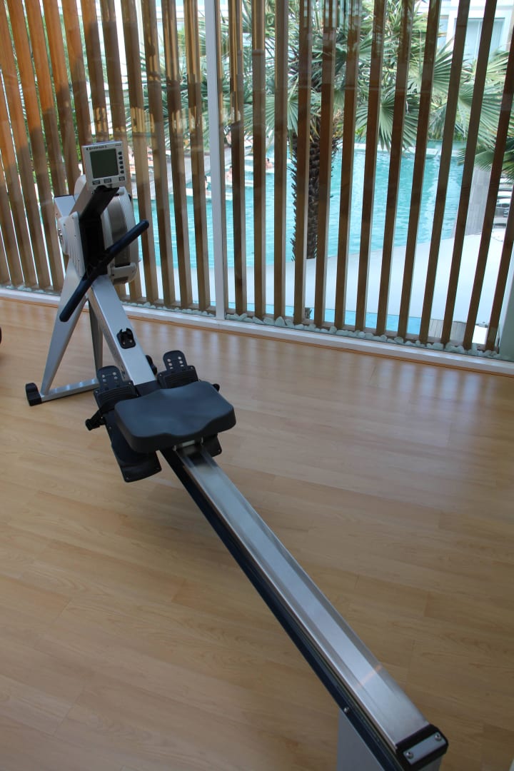 Fitnessraum über dem Restaurant mit Blick zum Pool