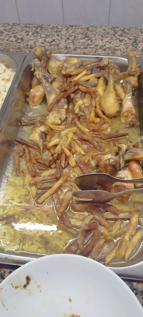 Essen von gestern mit Pommes von gestern zum Mittagessen