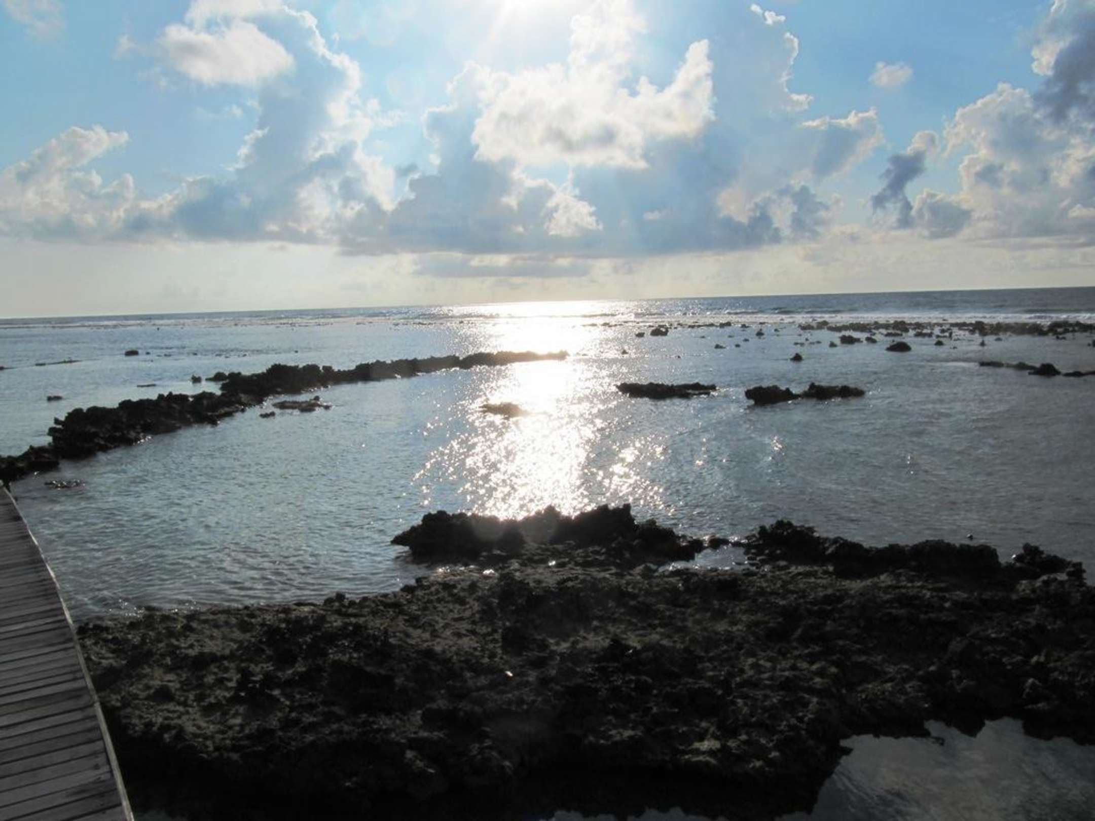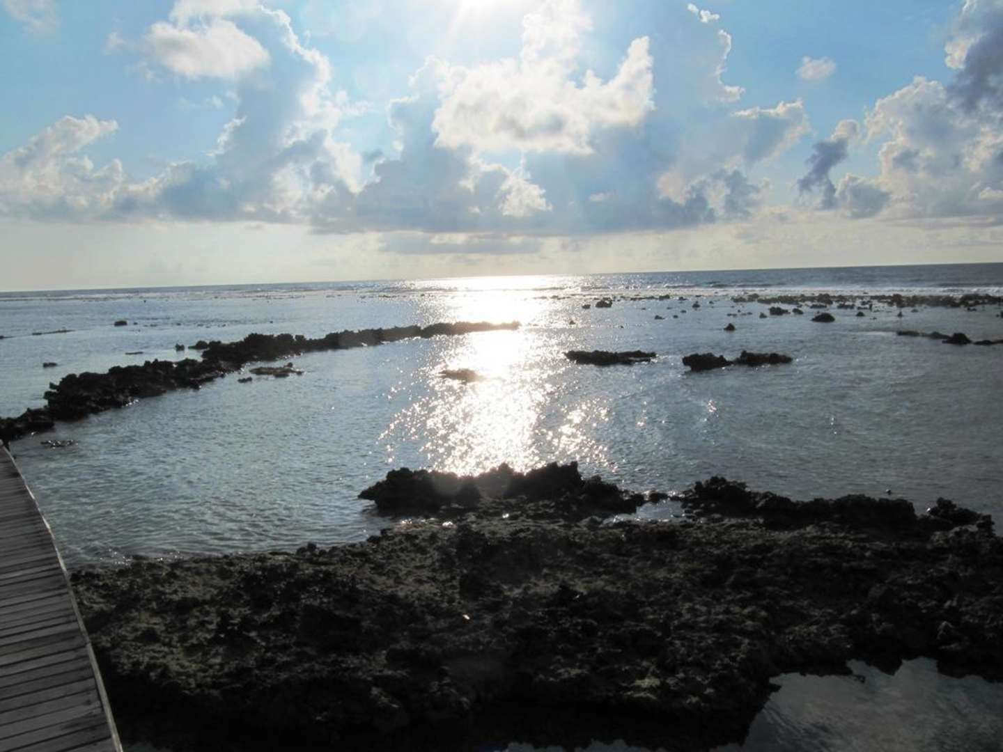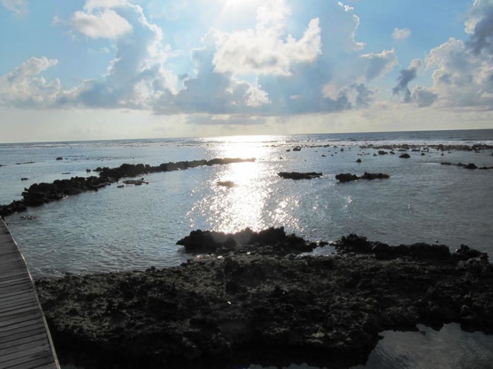 Bei "Ebbe" liegen weite Bereiche des Riffs frei und ueber einen Steg kann man ueber den Rand des Riffs laufen. Eigentlich handelt es sich aber bei dem Steg um den Zugang zu den Water Bungalows