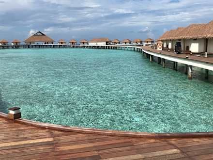 Übersichtsaufnahme vom Bungalow-Bereich, welche auf Stelzen im Meer stehen.