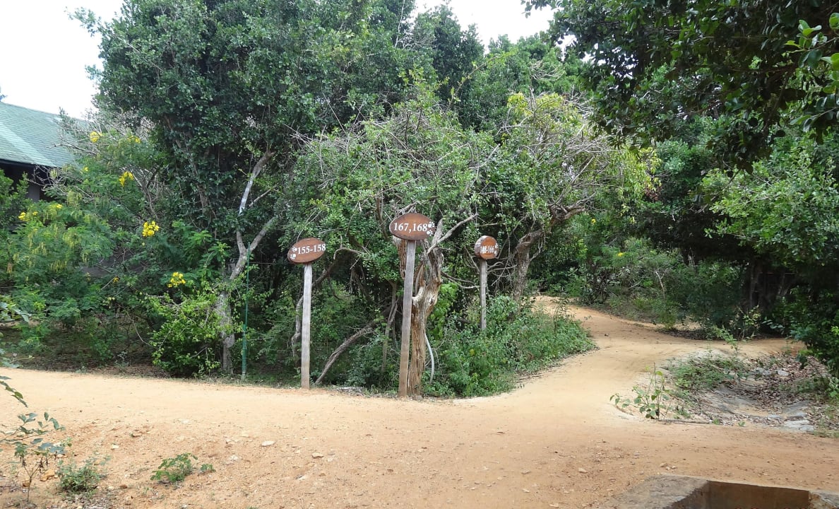 Garten mit Wegweiser zu den Bungalows