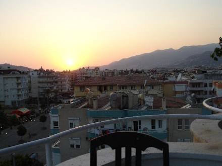 Blick von der Dachterrasse in Richtung Alanya bei Sonnenuntergang