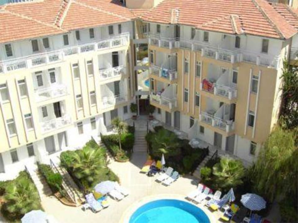 Blick vom Dachrestaurant zum Pool und Nebengebäude