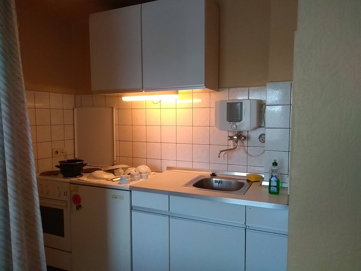 Küche, nachdem wir einen Kochtopf und Geschirr von der Rezeption geholt hatten