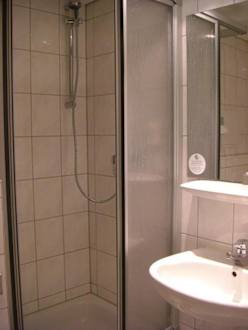 Blick ins kleine Bad mit Dusche und Waschtisch