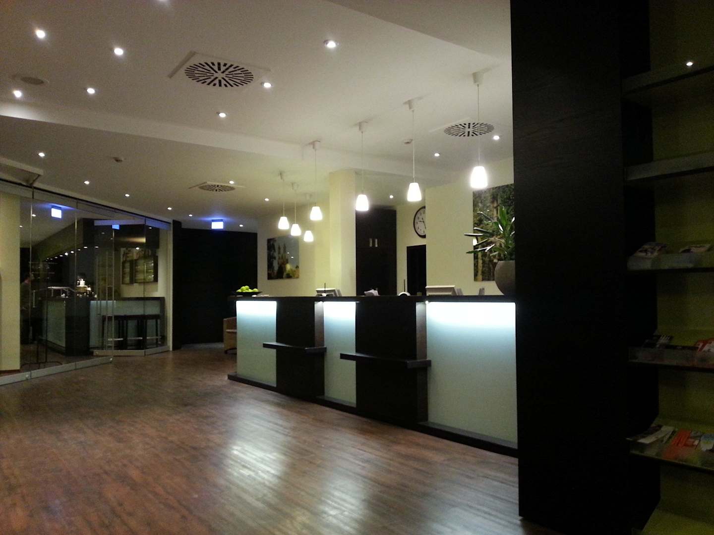 Rezeption am Abend. Dahinter der Frühstücksraum.