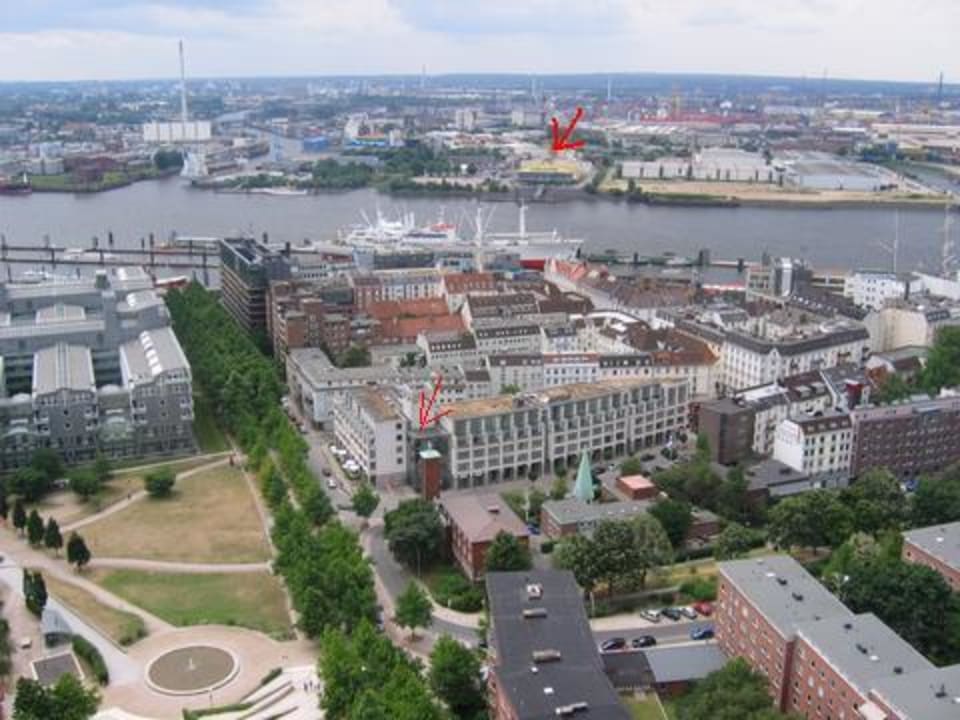 Im Vordergrung mit rotem Pfeil Eingangsturm Clipper Boardinghouse, im Hintergrung Hamburger Hafen mit Theater König der Löwen (gelbes Gebäude, roter Pfeil)