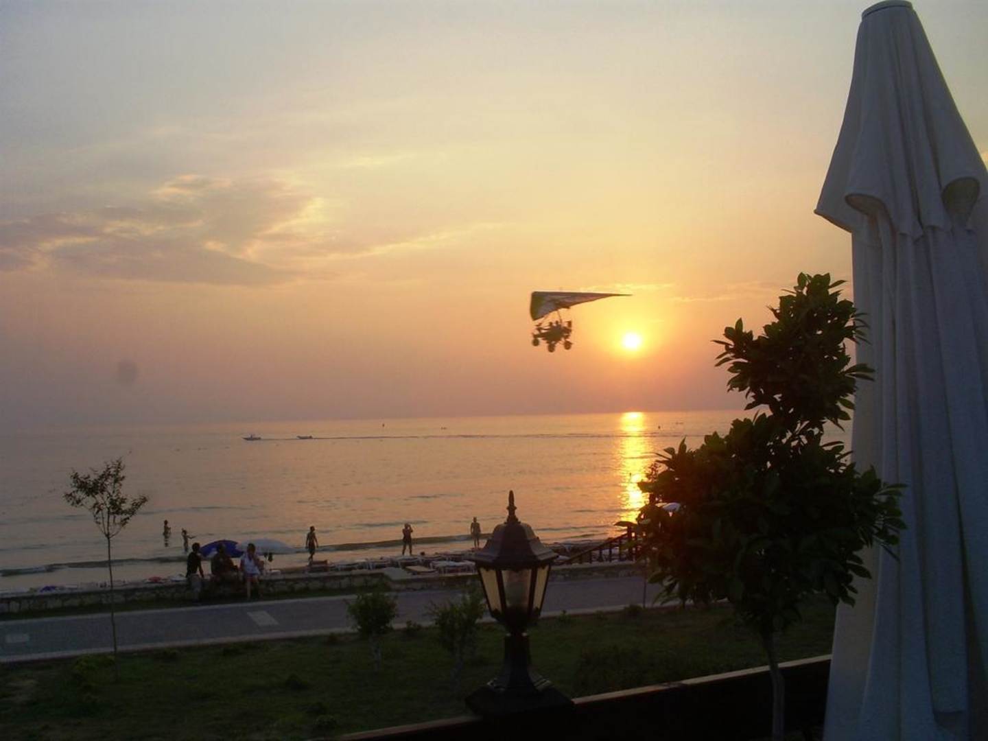 ein gelungener Schnappschuß: eigentlich wollte ich nur den Sonnenuntergang von der Restaurantterasse aus fotografieren, aber mit diesem Motor/Gleitschirmflieger macht es natürlich besonders was her ... *freu*