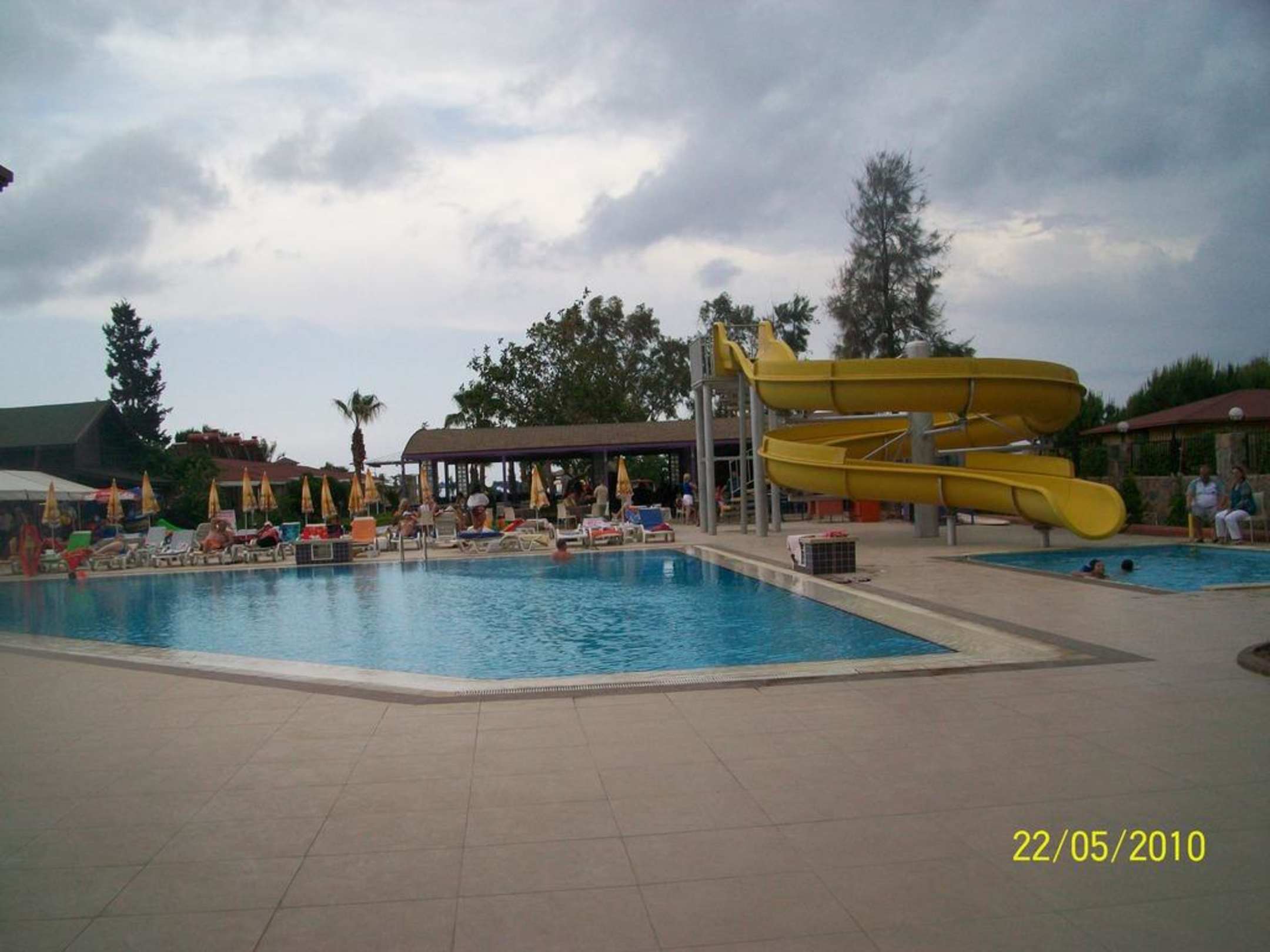 Poolanlage mit Rutsche, rechts Bar