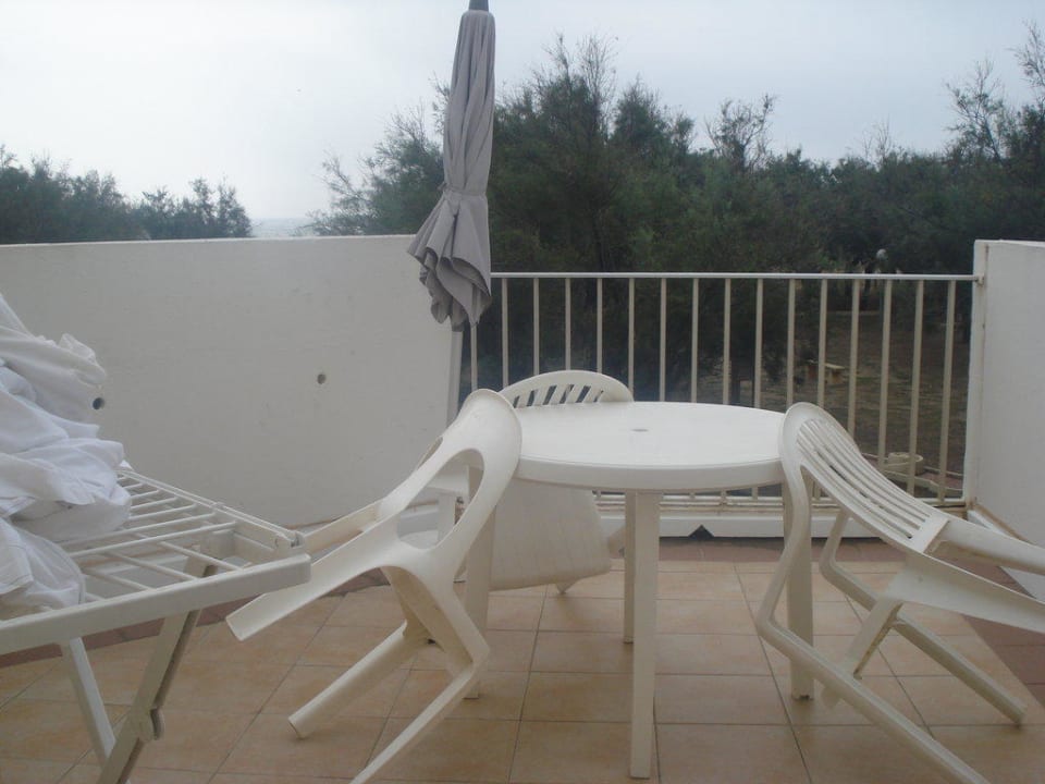Grande terrasse, vue sur plage (juste derrière les arbres), mobilier et parasol