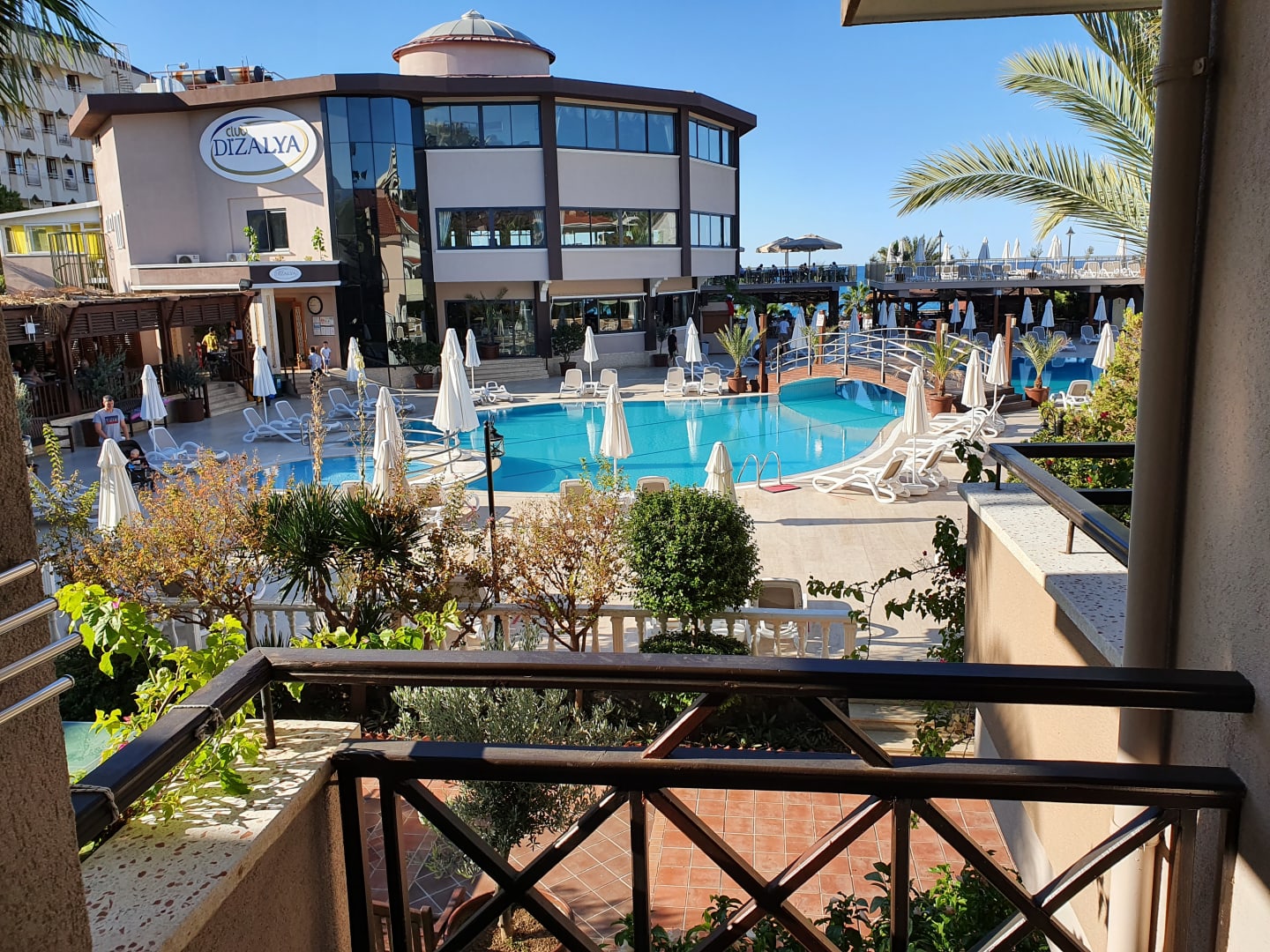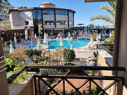 Pool mit Restaurant im Hintergrund. Fotografiert aus der Villa