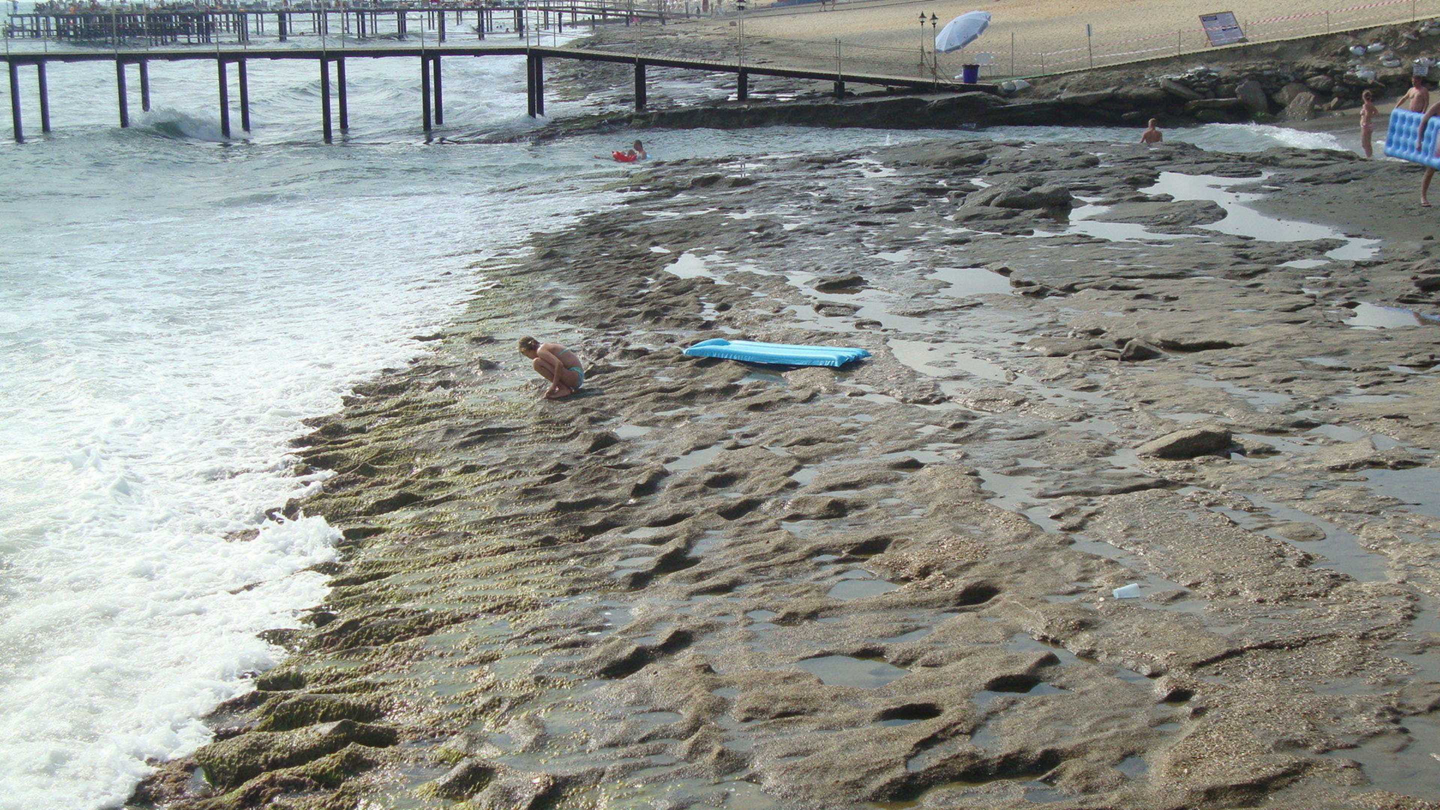 Katalogbeschreibung: direkt am mit feinem Kies durchsetzten Sandstrand (im Wasser teilweise vorgelagerte Kelsplatten) Der ganze Strand ist eine zerklüftete Felsplatte!