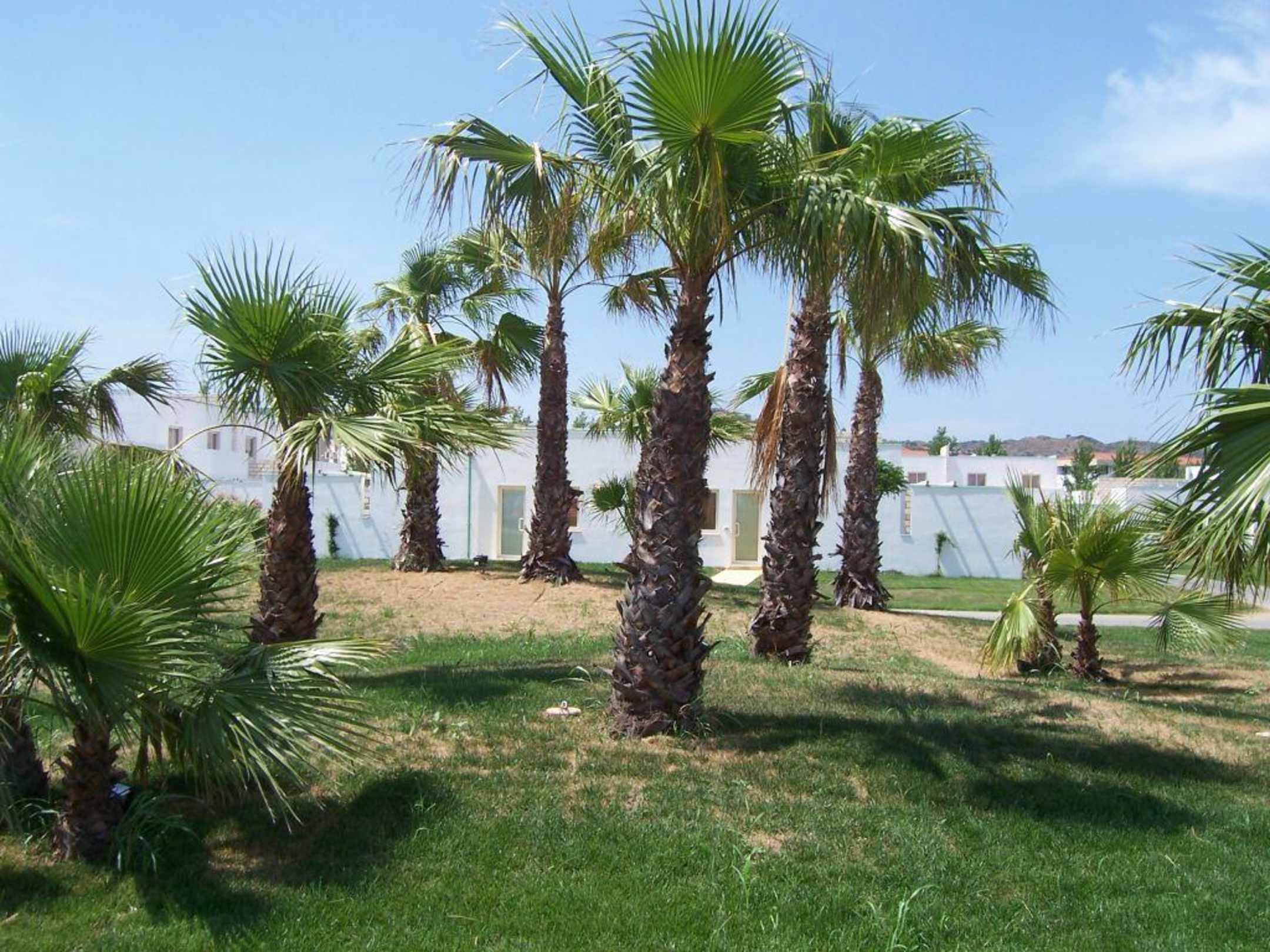 Palmen in der Nähe des Pools, abends beleuchtet