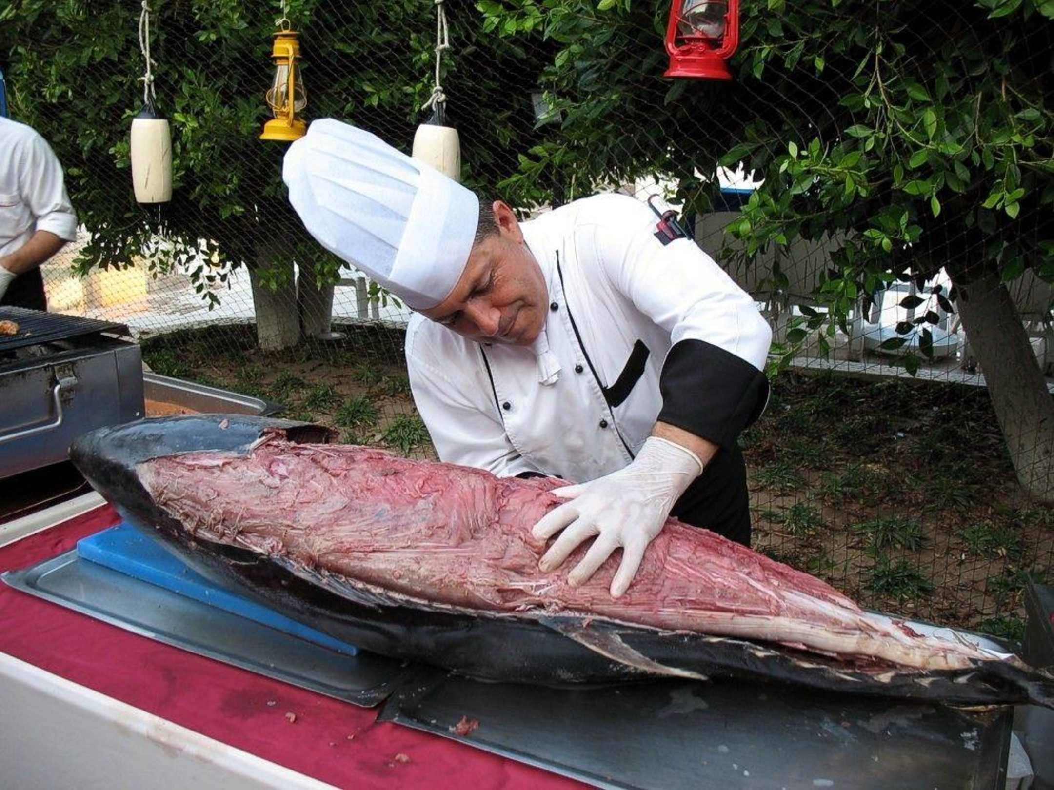 Ein Koch zerlegt und grillt einen Thunfisch.