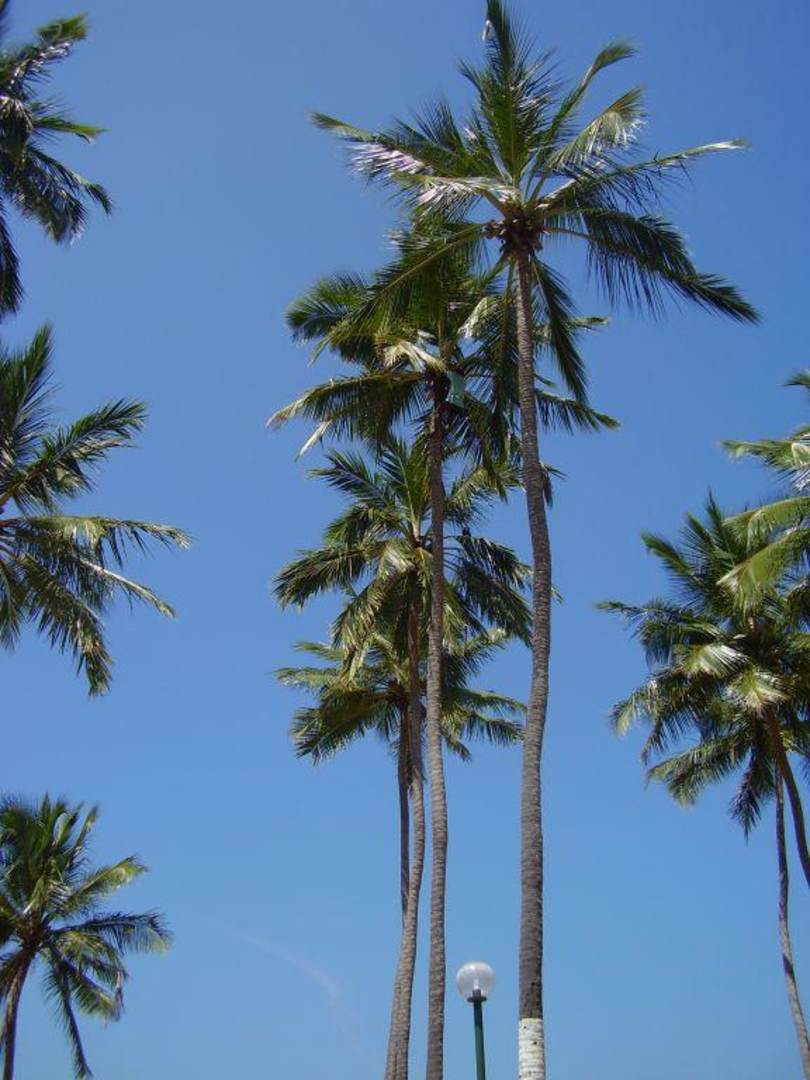 Gärtner schneidet die Kokosnüsse und Palmblätter