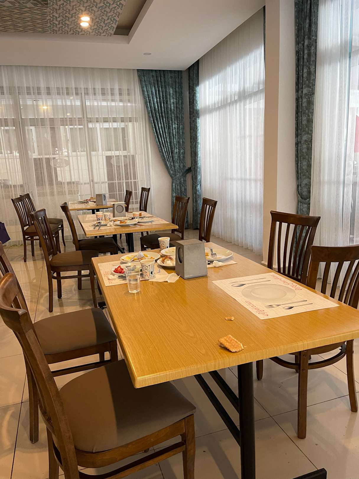 morgendliches Erscheinungsbild der Tische zum Frühstück. Personal hat lieber am Handy gespielt