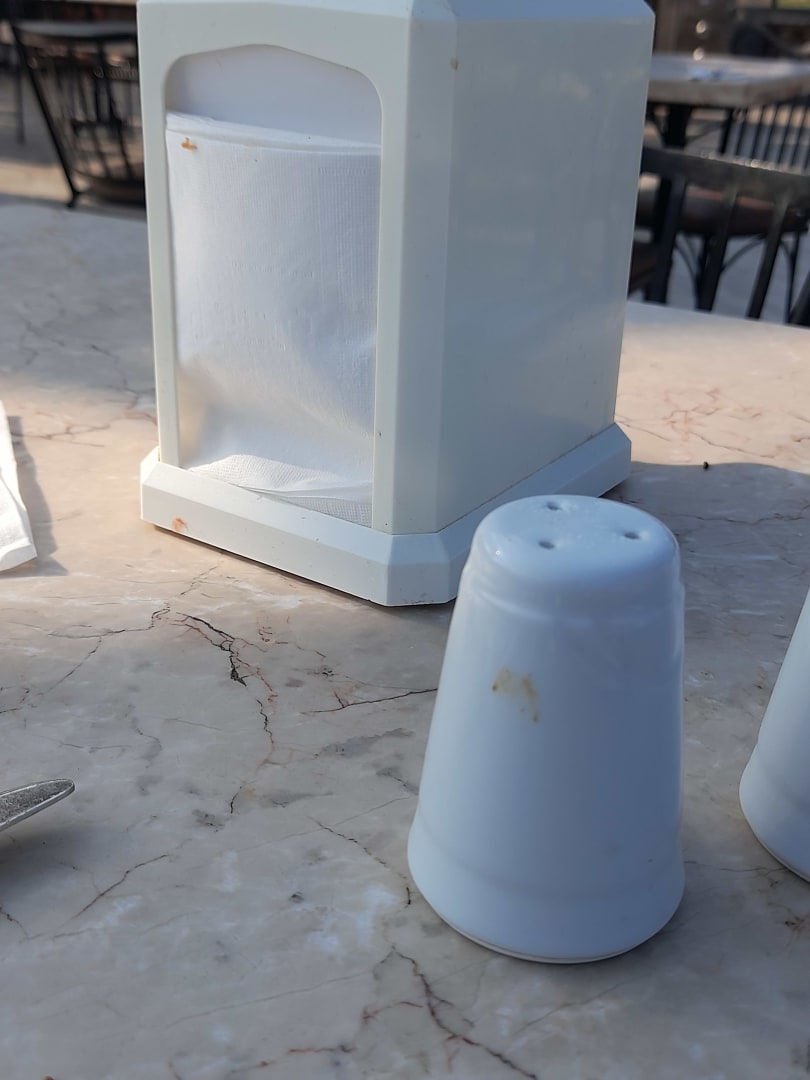 Schmutzige Salz und Pfefferstreuer. Vor dem Frühstück aufgenommen.