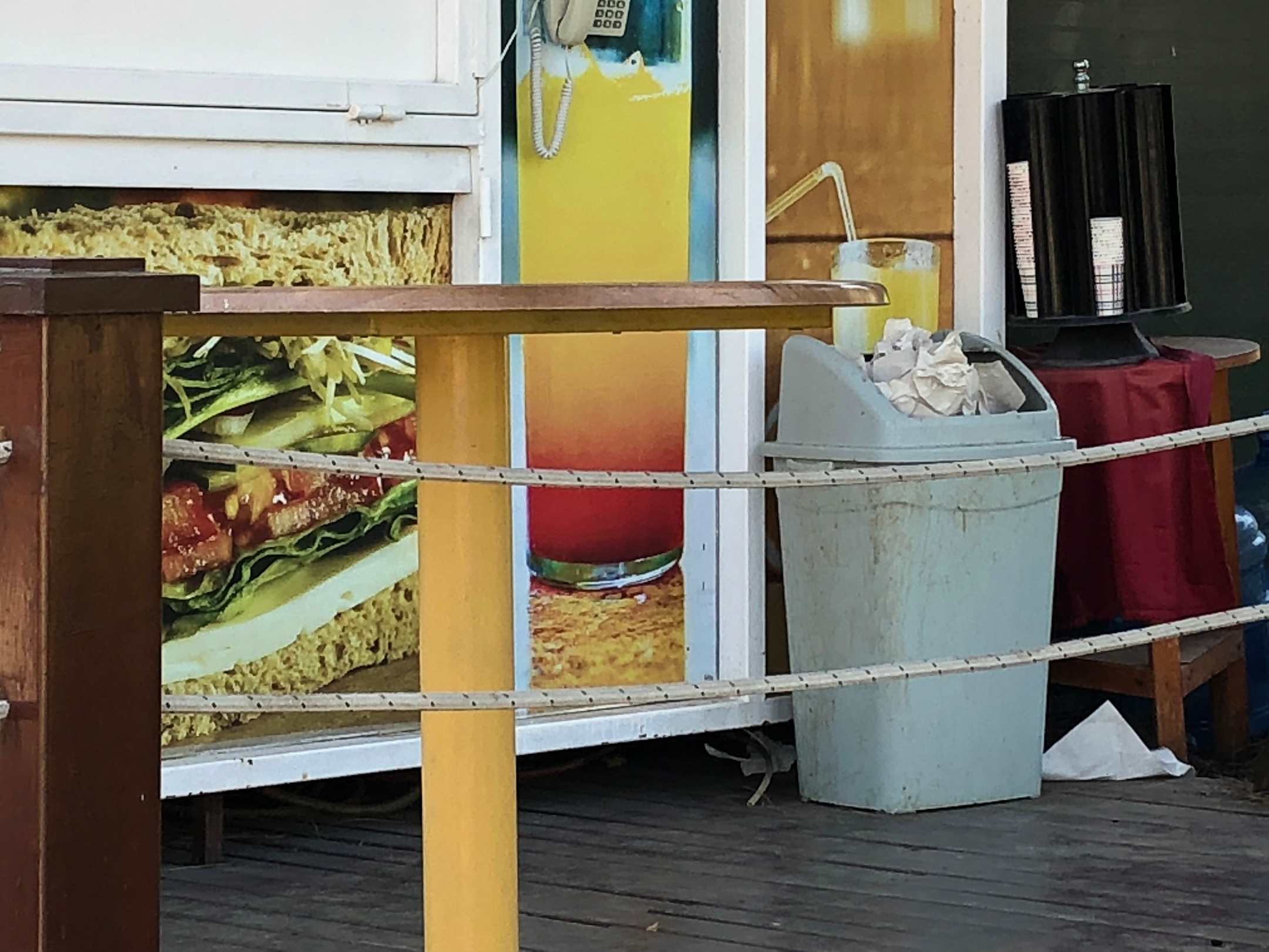 Verdreckter Mülleimer vor der Lunchbar.