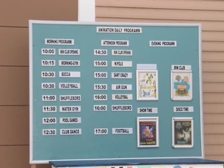 Infotafel für die Animationen und das Abendprogramm. Miniclub und Kinder-Mini-Disco sind täglich. Die Abendshows sind auch täglich ausser Montags. (in 2 Wochen keine (!) Wiederholungen)