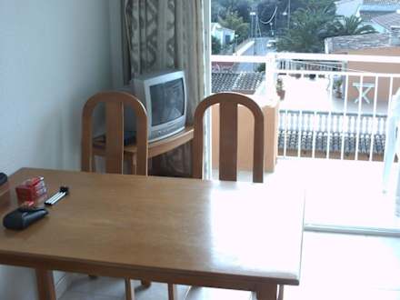 gepflegter EsstischEsstisch für 4 Pers. mit Blickrichtung zur Fernsehecke und zum Balkon.