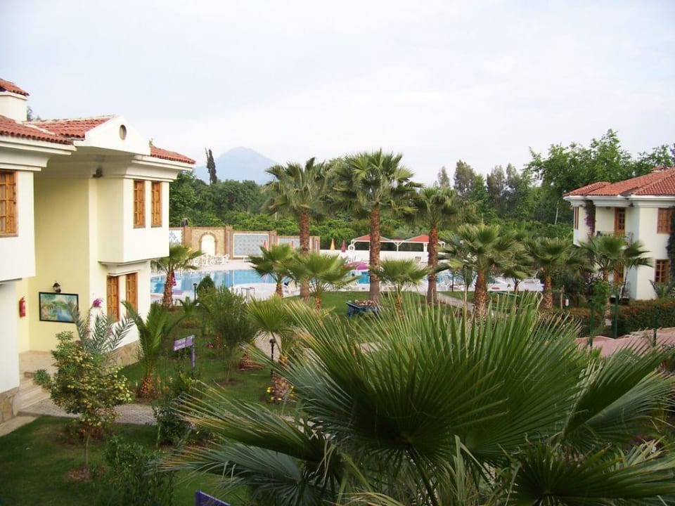 Blick vom Balkon eines Zimmers im 1. Stock des Park-Bereiches. Im Hintergrund der Pool. Sehr gepflegte und saubere Anlage mit vielen Pflanzen und Blumen. Das gilt auch für den Club-Bereich.