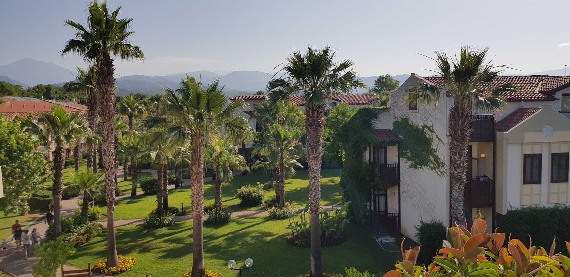 gepflegte Grünanlagen, rechts ein Haus im Clubbereich