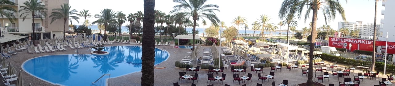 GastroAusblick von der Frühstücksterrasse auf den Poolbereich, Strand und den Supermarket neben dem Hotel.