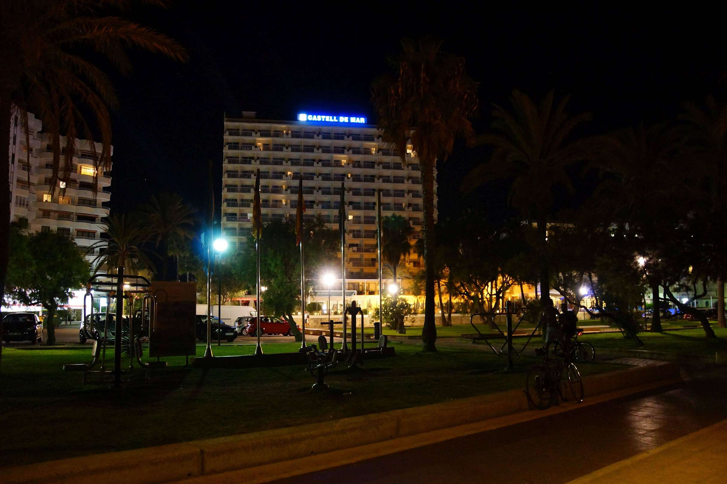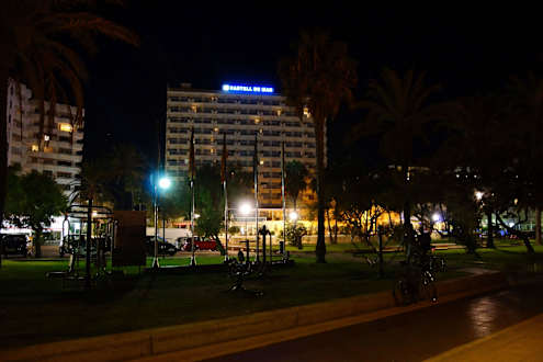Hotel von der Strandseite bei Nacht