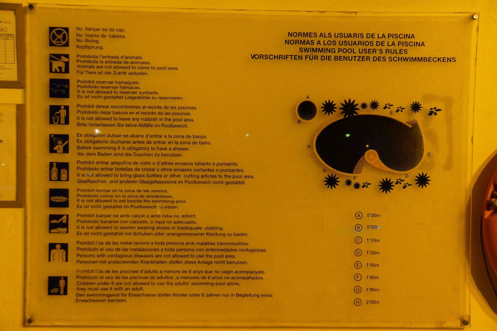 Hinweisschild und Information zur Pooltiefe